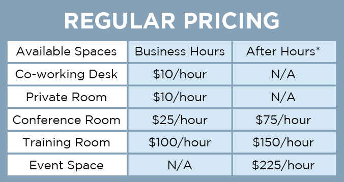 After hours - must book 2 weeks before desired date/time. Will include a facility fee*. (Coworking desks and Private Rooms A/B are not available after hours.)