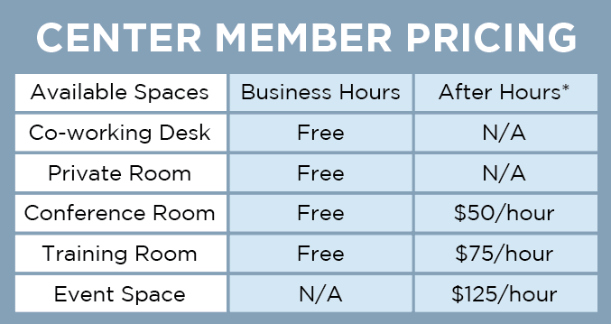 Center Members can book for free during business hours. Anyone can book a space and a discount is available to nonprofits who are not Center Members.